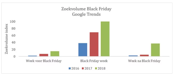 10:41Steeds meer Nederlandse webshops doen mee aan de van oorsprong Amerikaanse Black Friday, de dag waarbij veel winkels en webshops stunten met speciale aanbiedingen voor de feestdagen. In de afgelopen drie jaar is het zoekvolume op de zoekterm ‘Black Friday’ meer dan verdubbeld. Onderstaande afbeelding geeft de stijging in het zoekvolume met betrekking tot Black Friday weer van 2016 tot 2018.