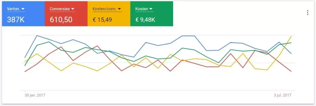 Bij het openen van de nieuwe AdWords interface valt de nieuwe lay-out direct op. Het kleurgebruik is volledig aangepast. De grijze tabellen zijn vervangen door harde kleuren om variabelen extra op te laten vallen. Je kunt nu ook gebruikmaken van vier lijnen, zodat je meer data in één overzicht kunt weergeven. De focus van de nieuwe interface ligt voornamelijk op het gemakkelijk en snel inzichtelijk maken van jouw resultaten. Google geeft aan dat de laadsnelheid van de accountgegevens met 20% is verbeterd.
