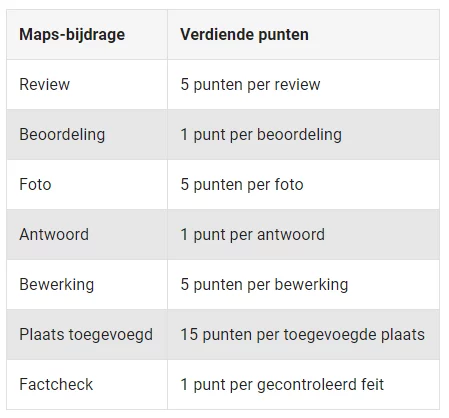 Als Local Guide verdien je nu meer punten door content toe te voegen aan Google Maps, volgens Google “om de bijdragen te belonen waar mensen het meest aan hebben.” Voor het schrijven van een recensie krijg je sinds de update bijvoorbeeld vijf punten, terwijl je hier voorheen maar één punt voor kreeg. Voor een beoordeling – het enkel geven van een score van 1 tot 5 sterren – kreeg je geen enkele punt maar wordt er nu wel één bij je totaalscore opgeteld. De meeste punten verdien je overigens door plaatsen toe te voegen op Google Maps. (Bron: Local Guides Help)