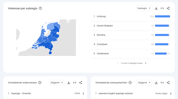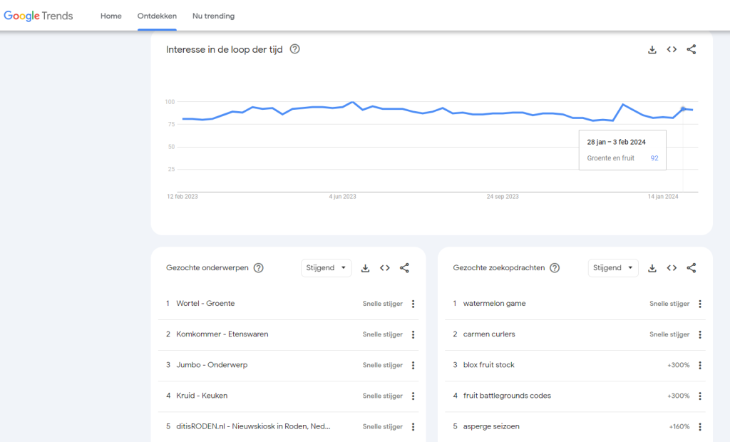 In onderstaand voorbeeld heb ik gekozen voor de categorie “Eten en drinken” > “Koken en recepten” > “Groente en fruit”. Zoals je kunt zien zijn er enkele Google Trends-zoekopdrachten met het label “snelle stijger”. Dit wijst op termen die recentelijk een significante toename in zoekvolume hebben gekregen. Dit kan komen door seizoensgebonden veranderingen, een recente gebeurtenis of een nieuwe trend in consumentengedrag. Een toename in zoekopdrachten naar specifieke groenten of fruit kan correleren met het oogstseizoen, een nieuwe gezondheidstrend of een populair dieet dat momenteel in de schijnwerpers staat.