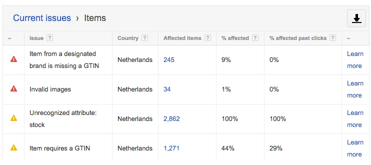 In deze stap kijk je naar de successen van voorgaande jaren. Welke Google Shopping campagnes presteerden de afgelopen jaren goed en welke minder? Ook is het belangrijk om in het Google Merchant Center in te loggen en te controleren welke producten actief zijn en correct werken. Let bij het controleren van je Google Shopping campagnes in het Merchant Center op de volgende punten: