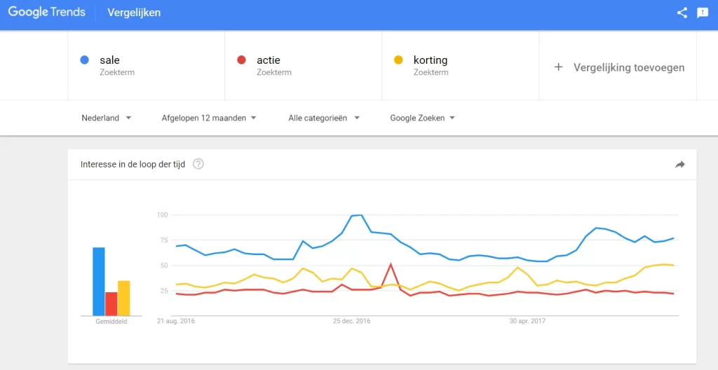 Hieronder een voorbeeld van het trendvolume van de volgende zoektermen: korting, sale en acties. Zoals je kunt zien is met name het zoekwoord ‘sale’ een piek rond de kerstperiode. Op zich logisch, want niemand wil te veel betalen voor dat perfecte cadeau!