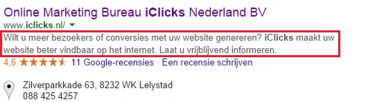 Bij iClicks hebben wij veel ervaring met het schrijven van uitstekende meta descriptions. Wilt u meer weten over de mogelijkheden? Kijk dan eens op onze pagina over zoekmachine optimalisatie of neem gelijk contact met ons op door te bellen naar 088-425 4257.
