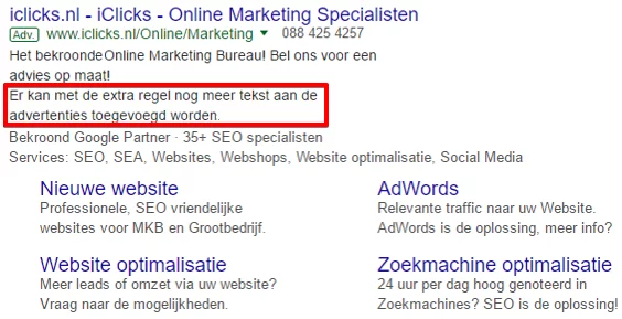 Indien de aanvullende beschrijving van de advertentietekst getoond wordt, dan zal deze onder de eerste beschrijvingsregel getoond worden.